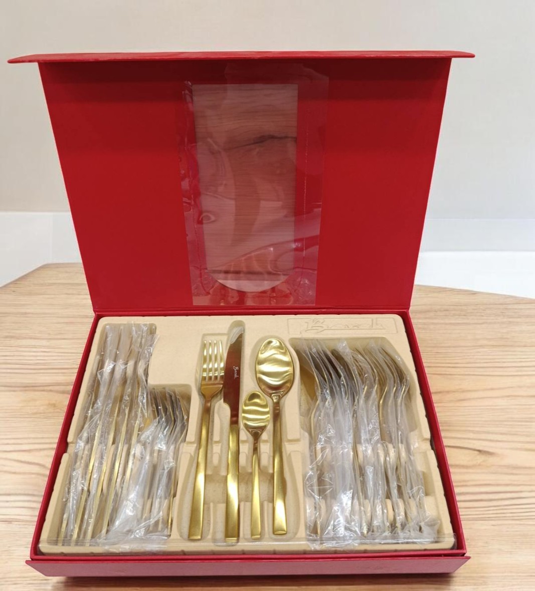 Escajg set gold mat sastoji se od 24 komada elegantnog pribora za jelo, namenjenog za svakodnevnu upotrebu i posebne prilike. Mat zlatna završna obrada daje moderan i luksuzan izgled, dok jednostavan dizajn omogućava lako uklapanje sa različitim stilovima posuđa.