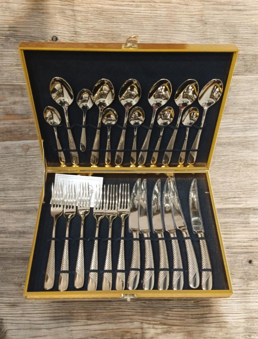 Escajg set zlatni namenjen je za 6 osoba i predstavlja elegantan izbor za svakodnevnu upotrebu ili svečane trpeze. Zlatna boja daje stolu luksuzan izgled, dok praktičan i uravnotežen dizajn omogućava prijatno korišćenje.