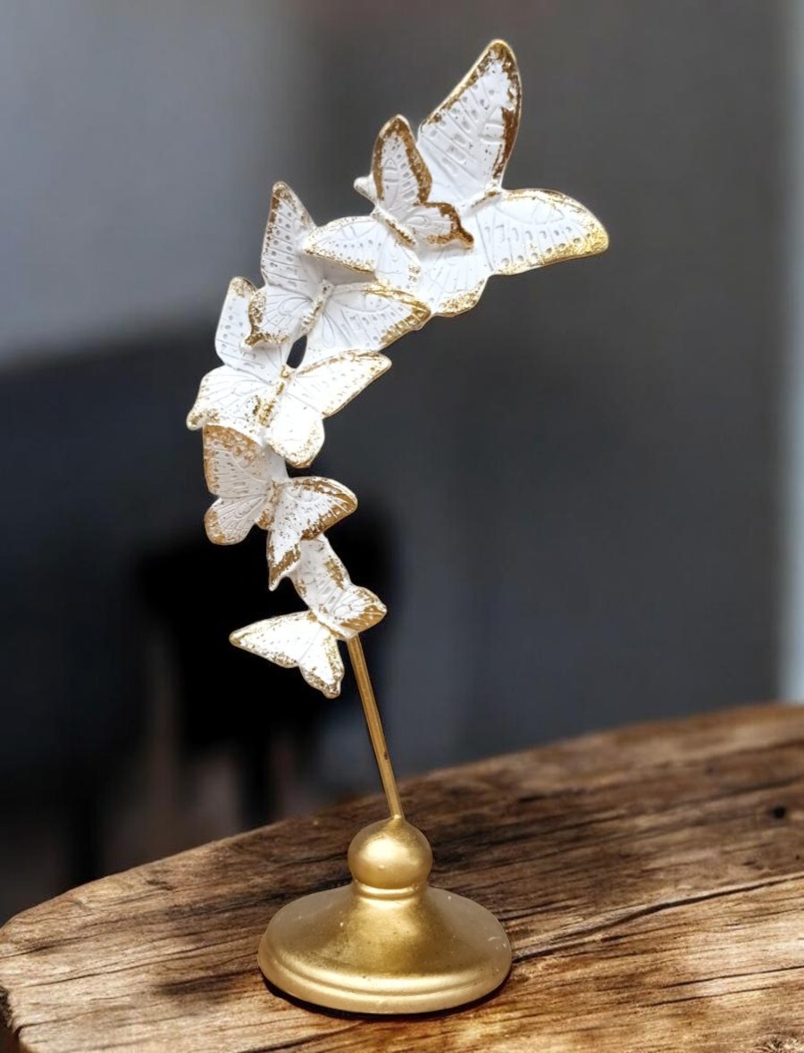 Figura leptir izrađena od polirezina, sa zlatnim detaljima, idealna je za dekoraciju doma. Može se postaviti na policu, sto ili u cvetni aranžman, dodajući prostoriji živost i elegantan detalj.