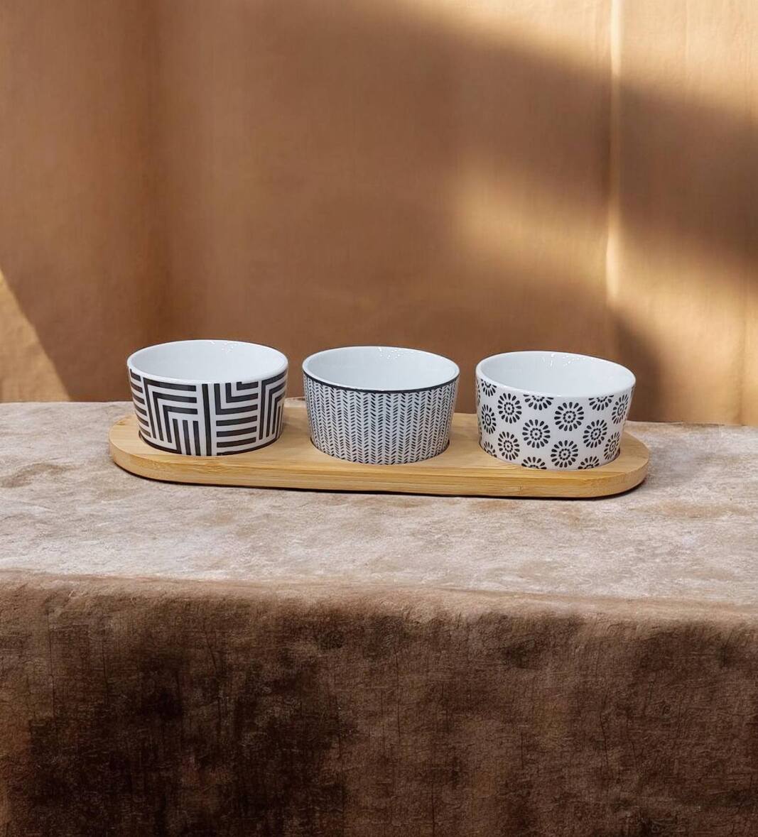 Set se sastoji od tri keramičke posude pažljivo postavljene na bambus dasku dimenzija 30×10×4 cm. Kompaktne dimenzije omogućavaju pregledno serviranje različitih namirnica na jednom mestu, dok prirodni bambus daje toplinu i sofisticiran izgled.