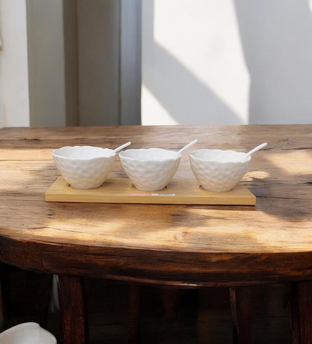 Elegantni i praktični set za serviranje hrane koji uključuje tri posude, dasku i kašiku, idealan je za prezentaciju različitih jela i predjela. Savršen je za svakodnevnu upotrebu, ali i za posebne prilike kada želite da vaš sto izgleda uredno i sofisticirano.