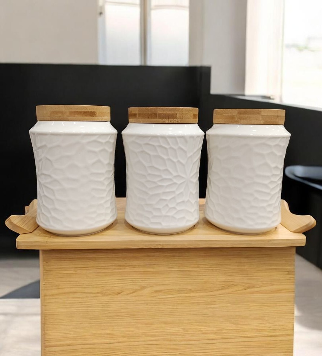 Set od tri kuhinjske posude bele boje, namenjene za odlaganje šećera, soli i brašna. Praktične i elegantne, idealne za organizaciju kuhinje i svakodnevnu upotrebu.