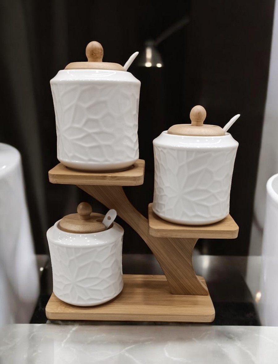 Set od tri kuhinjske posude bele boje, namenjene za odlaganje šećera, soli i brašna. Praktične i elegantne, idealne za organizaciju kuhinje i svakodnevnu upotrebu.