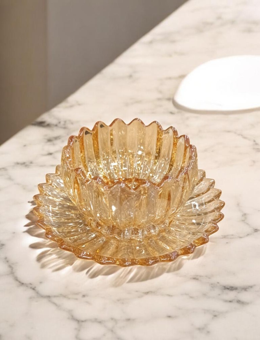 Elegantni set od šest staklenih posuda u zlatnoj boji, sa pripadajućom tacnom. Savršen za serviranje i dekoraciju, ovaj set unosi luksuzan i sofisticiran izgled na sto i u svaki prostor.