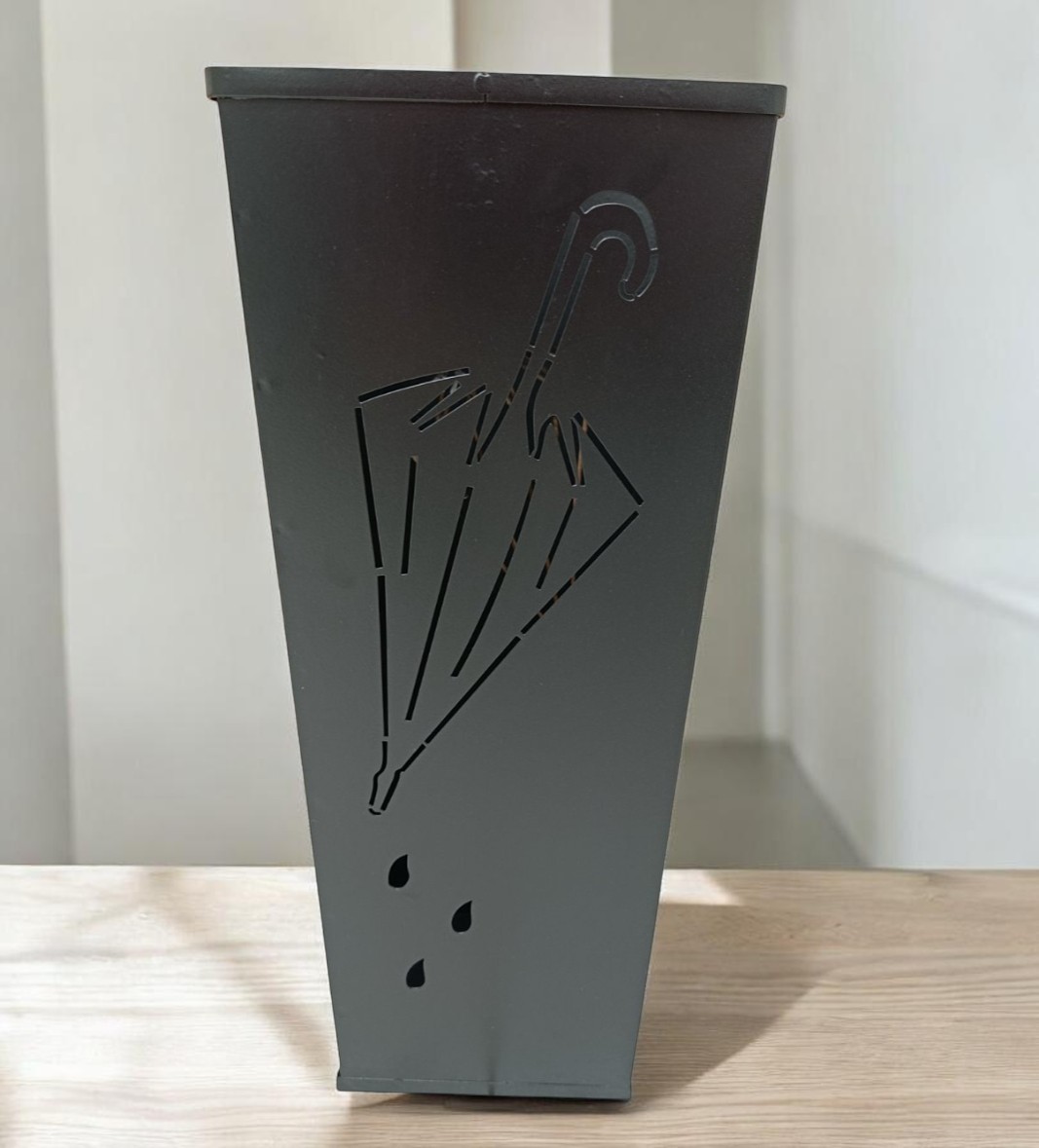 Crni stalak za kišobrane praktičnog i elegantnog dizajna, namenjen za uredno odlaganje kišobrana kod ulaza u dom ili kancelariju. Stabilan i funkcionalan, čuva prostor i dodaje organizovan izgled prostoru.