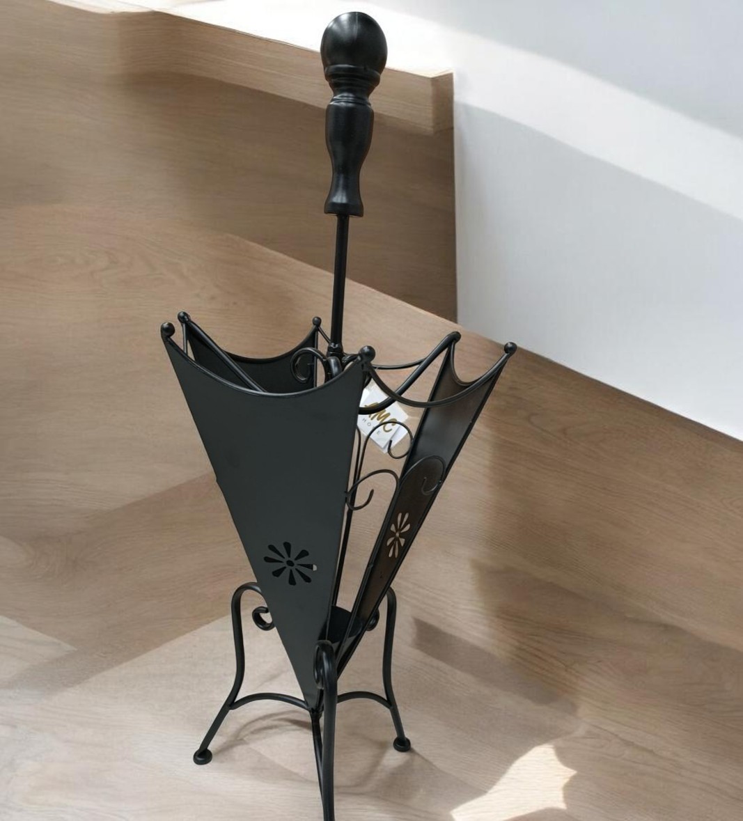 Crni stalak za kišobrane praktičnog i elegantnog dizajna, namenjen za uredno odlaganje kišobrana kod ulaza u dom ili kancelariju. Stabilan i funkcionalan, čuva prostor i dodaje organizovan izgled prostoru.