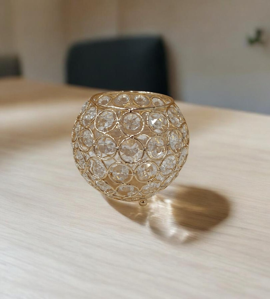 Zlatni svećnjak sa kristalima donosi dozu luksuza i elegancije u svaki prostor. Sjajni kristalni detalji u kombinaciji sa zlatnom završnom obradom stvaraju sofisticiran ambijent, idealan za svečane trpeze, dekoraciju enterijera ili posebne prilike.