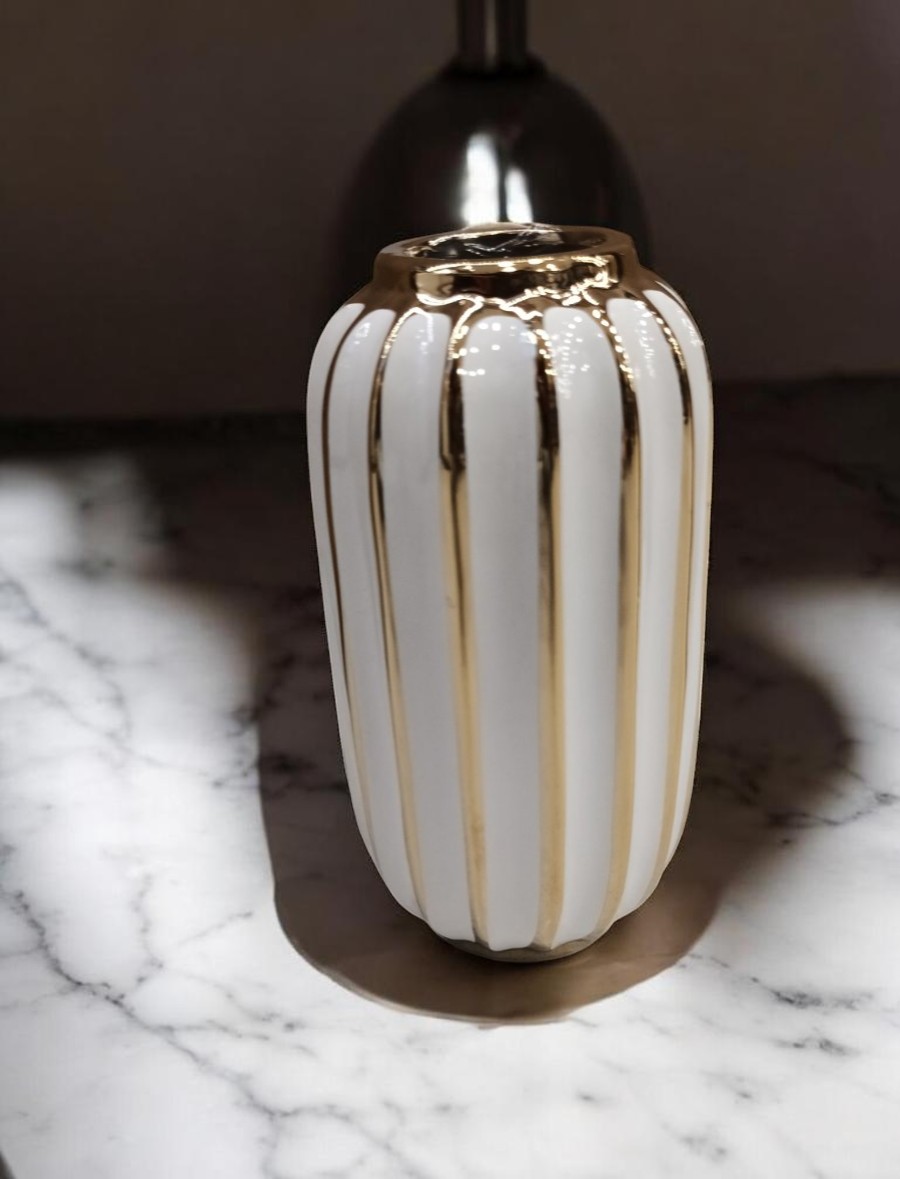 Elegantna vaza bele boje sa zlatnim detaljima, idealna za izlaganje svežeg ili sušenog cveća, ali i kao samostalni dekorativni detalj u domu. Dodaje sofisticiran i luksuzan šarm svakoj prostoriji.