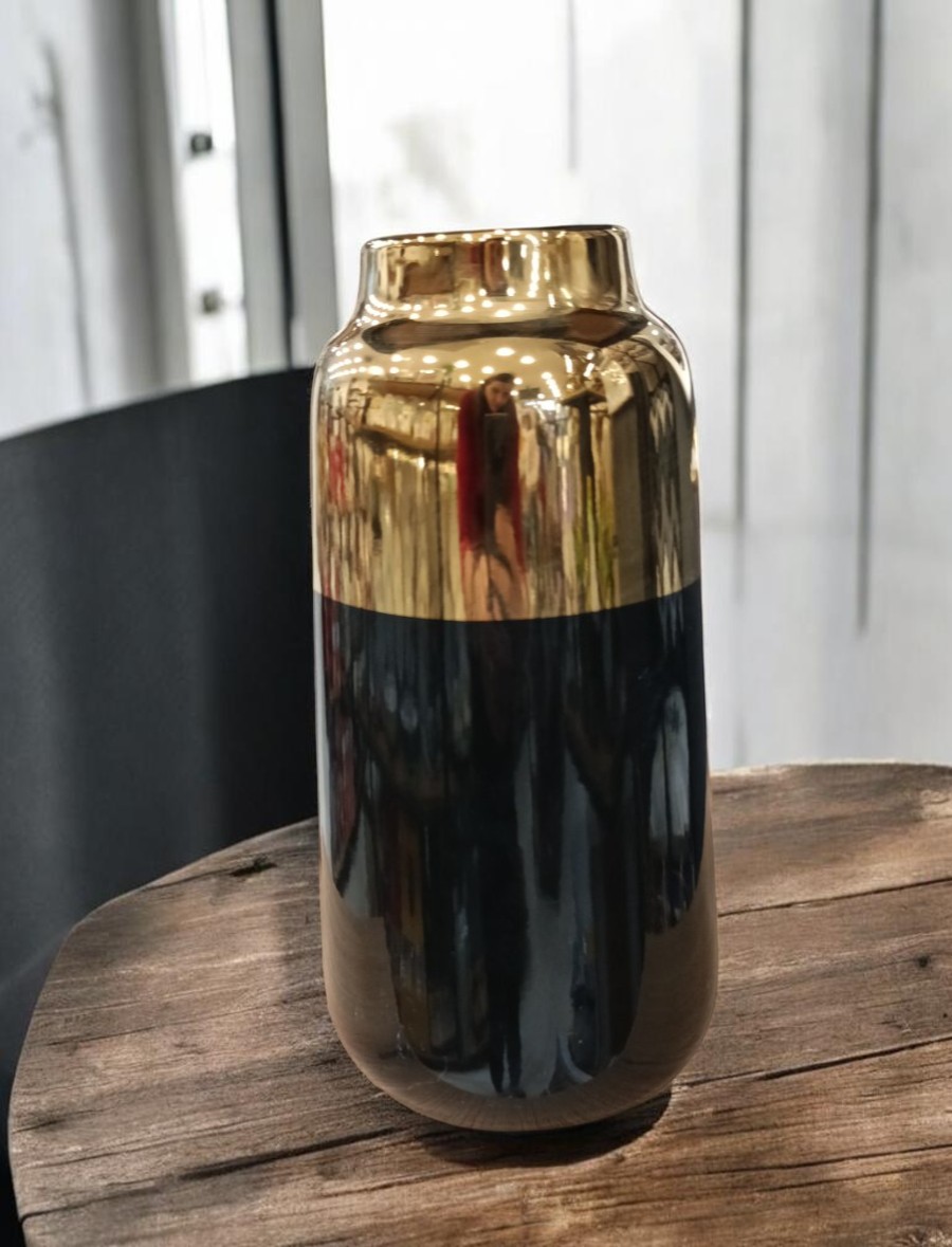 Elegantna vaza crne boje sa zlatnim detaljima, idealna za izlaganje svežeg ili sušenog cveća, ali i kao samostalni dekorativni detalj u domu. Dodaje sofisticiran i luksuzan šarm svakoj prostoriji.