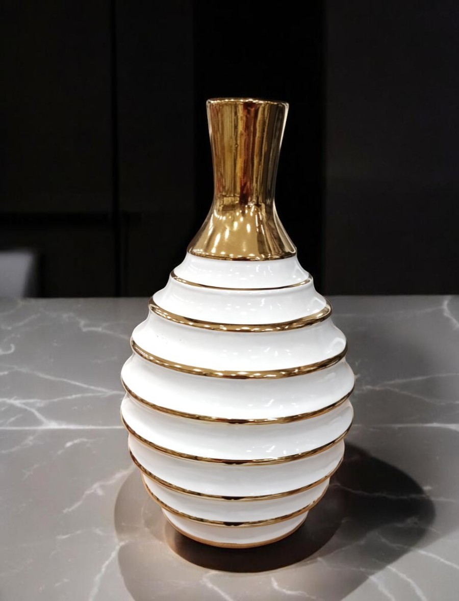Elegantna vaza bele boje sa zlatnim detaljima, idealna za izlaganje svežeg ili sušenog cveća, ali i kao samostalni dekorativni detalj u domu. Dodaje sofisticiran i luksuzan šarm svakoj prostoriji.