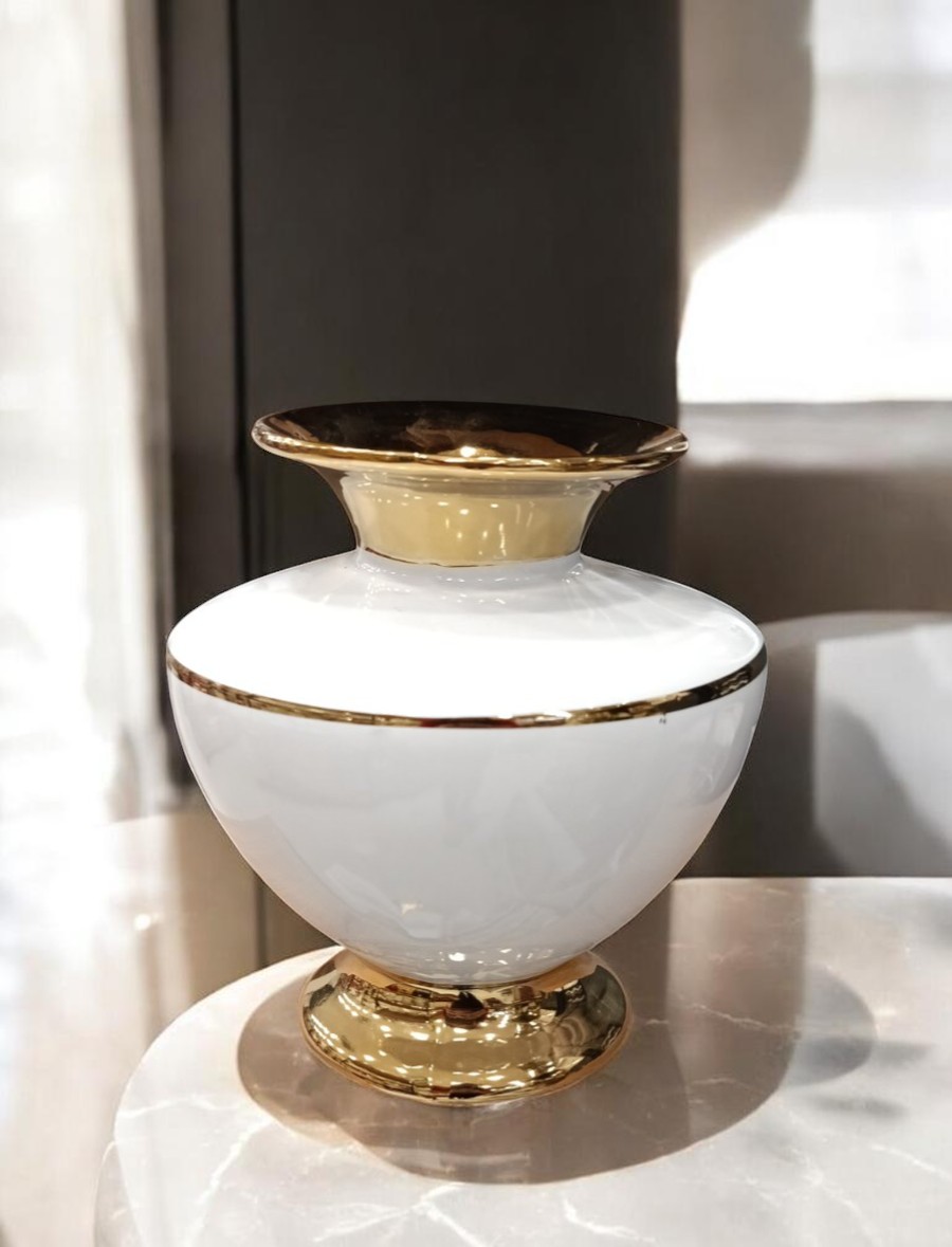 Elegantna vaza bele boje sa zlatnim detaljima, idealna za izlaganje svežeg ili sušenog cveća, ali i kao samostalni dekorativni detalj u domu. Dodaje sofisticiran i luksuzan šarm svakoj prostoriji.