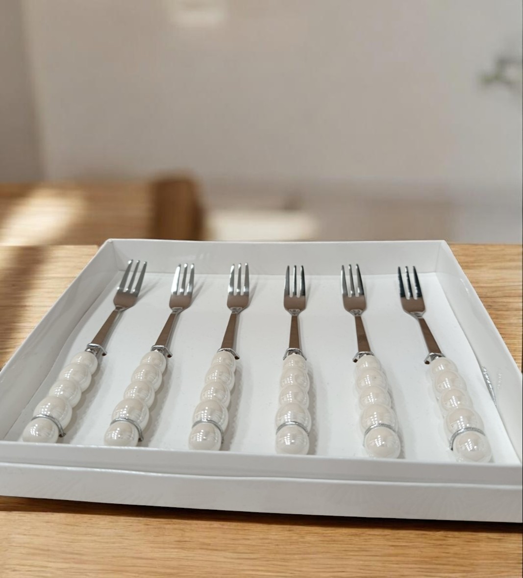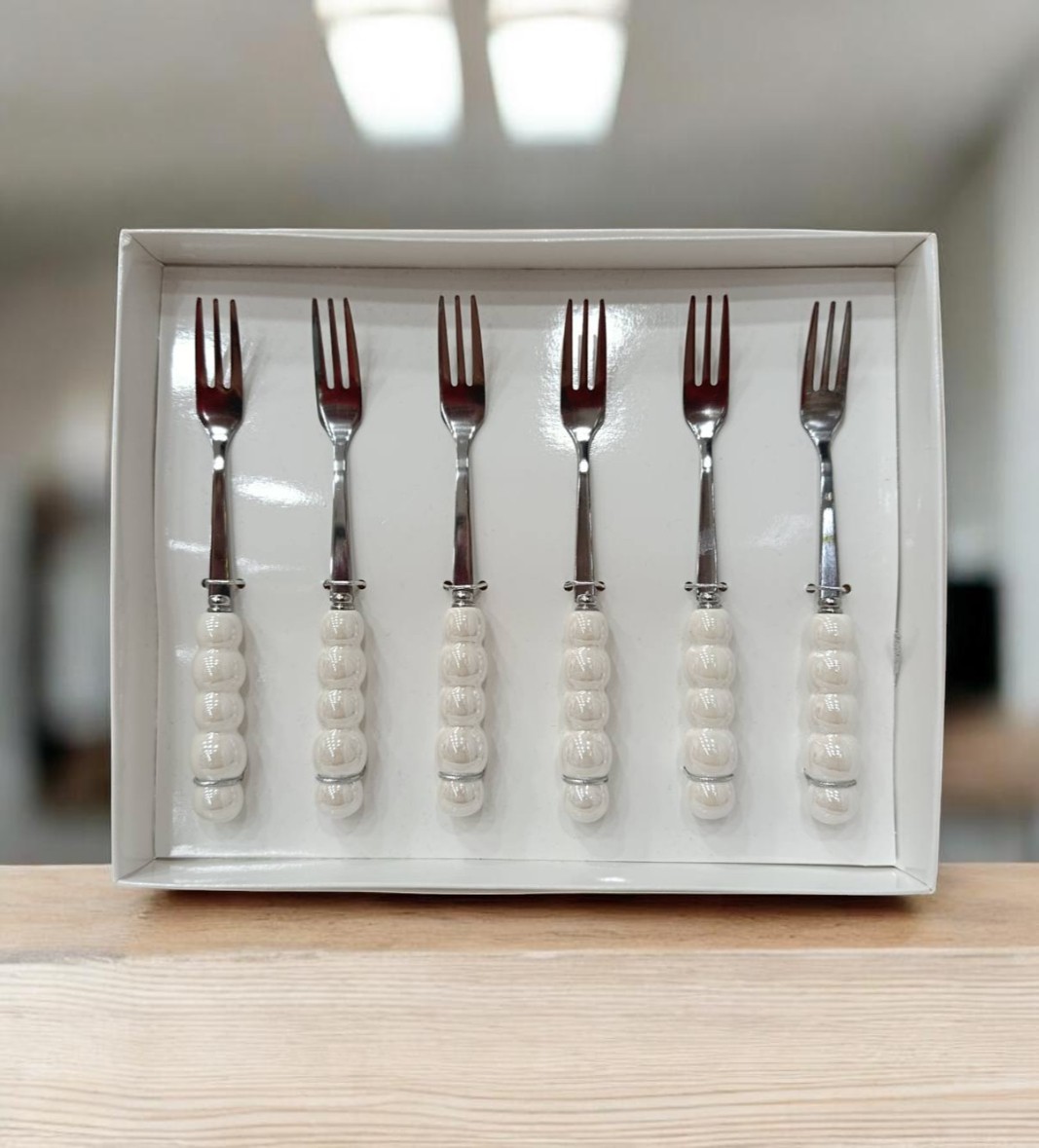 Viljuška izrađena je od kombinacije metala i keramike, sa pažljivo oblikovanom drškom koja obezbeđuje eleganciju. Praktična je za svakodnevnu upotrebu, a zahvaljujući kvalitetnim materijalima istovremeno ima i estetski izgled.